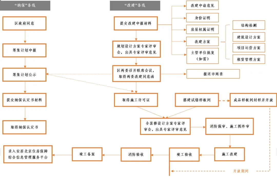 項(xiàng)目的申請(qǐng)和審批有“納保”和“改建”兩種方式:“納保”指經(jīng)政府同意后,項(xiàng)目納入保障性租賃住房年度建設(shè)籌集計(jì)劃,并取得保障性租賃住房項(xiàng)目認(rèn)定書,繼而享受國家政策優(yōu)惠的過程;“改建”指實(shí)施主體按照有關(guān)要求將現(xiàn)有存量建筑裝修改建為保障性租賃住房的過程。流程具體如下圖(以北京市為例):